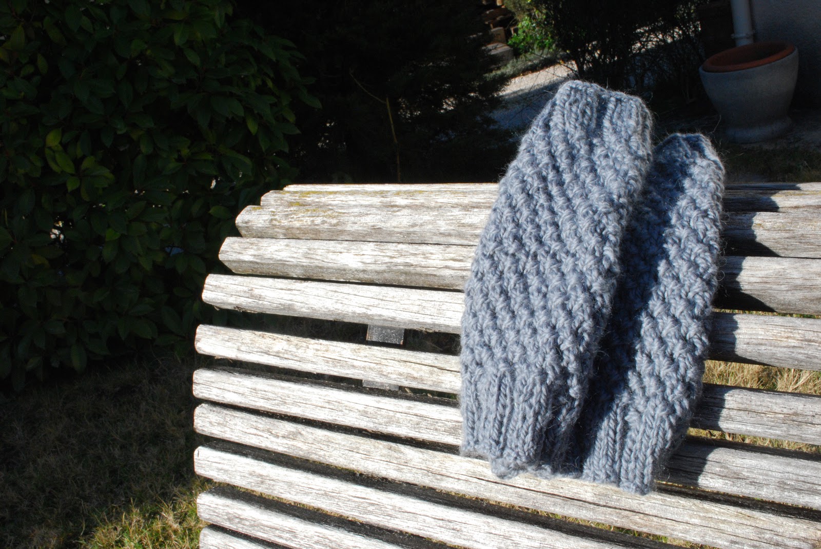 J’avais deux pelotes Andes de Drops design coloris bleu vert gris, alors j’ai suivi mes envies avec mes aiguilles tailles 9 (comme ça, il monte viiiiite).