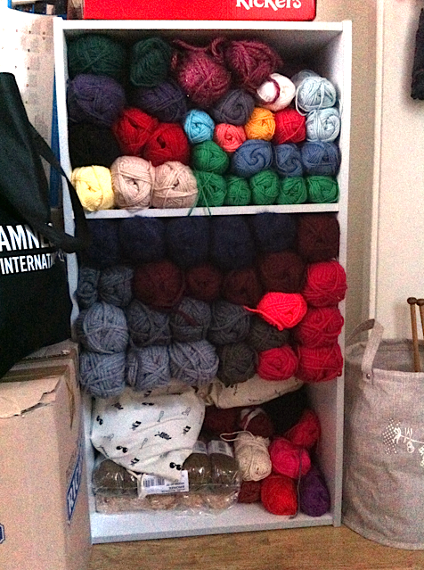 Sachant que le meuble est assez profond pour accueillir deux rangées de pelotes… et qu’il y en a dans le carton, dans le sac noir à gauche, dans la boite Kickers en haut et dans le petit sac à tricot à droite… Bon, et aussi dans une boite qui ne se trouve pas dans la photo… et dans mon armoire chez mes parents aussi… mais ça ne compte pas, non 🙂 ?