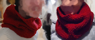 Je les ai tricoté en deux jours, c’est monté très vite grâce aux aiguilles taille 12 pour le bonnet et taille 15 pour le tour de cou.